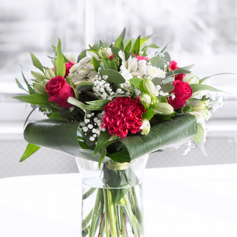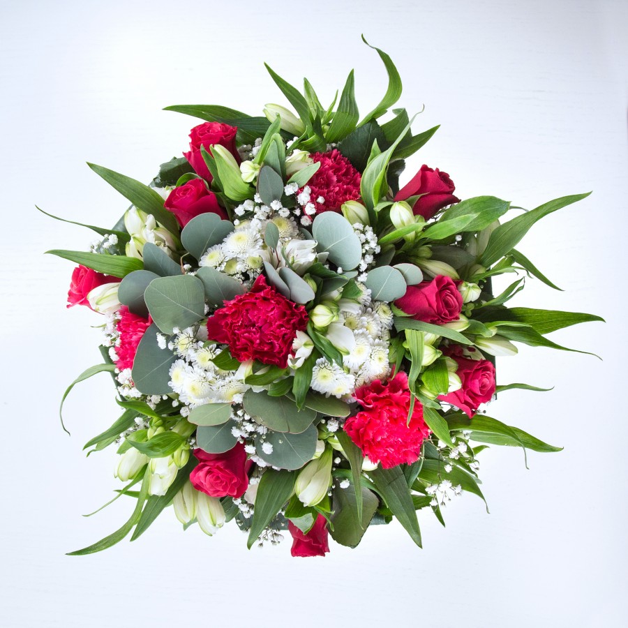 Experience the stunning elegance of our red and white bouquet. Featuring radiant red roses, pure white chrysanthemums, and delicate gypsophila, this arrangement is beautifully complemented by carnations, white alstroemeria, and aspidistra leaves for a unique and captivating look.