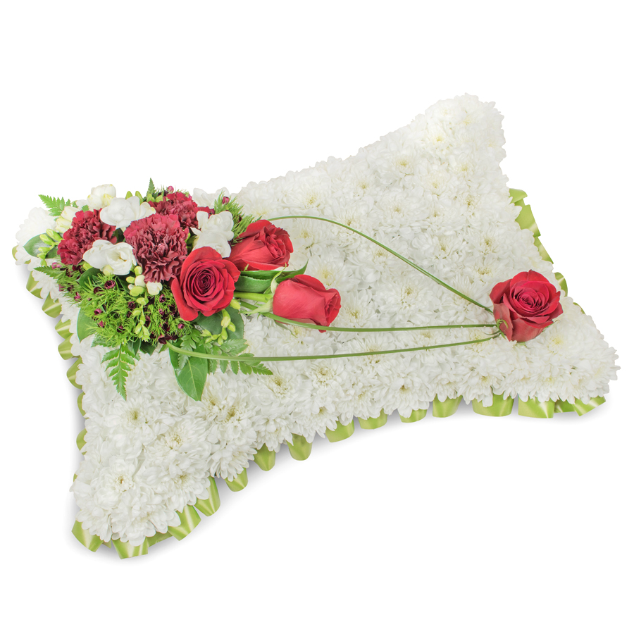 Share your deepest sympathies with our heartfelt condolence bouquet, showcasing a stunning mix of white chrysanthemums, red roses, white freesias, and dark red carnations. Accented with dianthus and bear grass, this arrangement is both unique and profoundly beautiful.
